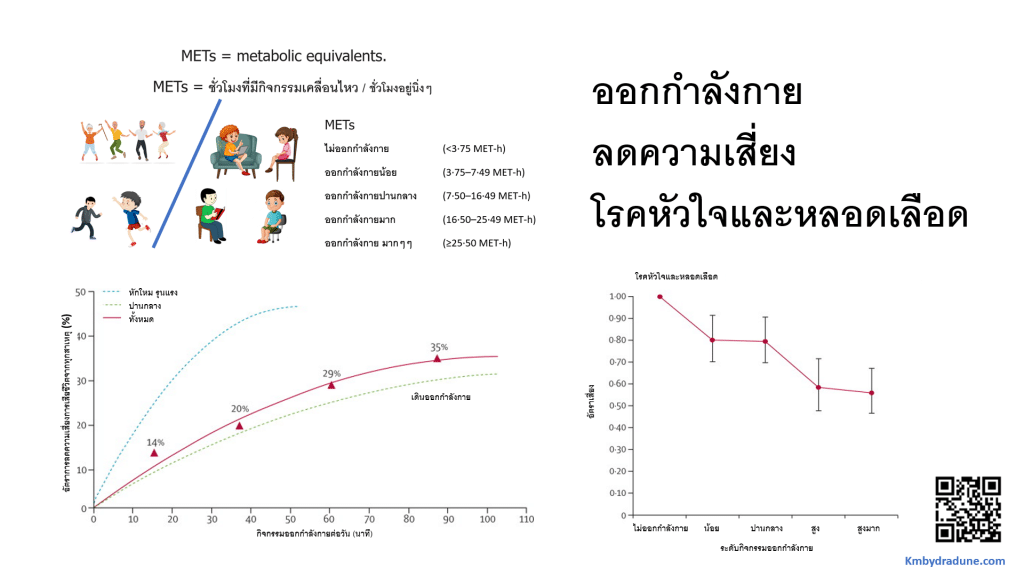 -จากการศึกษา พบว่า การออกกำลังกาย ช่วยลดอัตราการเสียชีวิตจากทุกสาเหตุ และ ในการศึกษา ประชากร อายุมากกว่า 20 ปี จำนวน 416 175 คน (ชาย 199 265 คน และ หญิง 216 910 คน) เมื่อเปรียบเทียบสัดส่วนการออกกำลังกาย METs = metabolic equivalents โดยแบ่งเป็นกลุ่ม ไม่ออกกำลังกาย ออกกำลังกายน้อย ปานกลาง และ มาก พบว่า กลุ่มที่มีการออกกำลังกาย (มีการเคลื่อนไหวมากกว่าหยุดนิ่ง 3.75 เท่าขึ้นไป) มีความเสี่ยงจากการเสียชีวิตด้วยโรคต่างๆ น้อยลง และ เสี่ยงต่อการเสียชีวิต จากโรคหัวใจและหลอดเลือด(รวมถึง อัมพาต โรคหลอดเลือดสมอง) ลดลง เกือบ ครึ่งหนึ่ง ในรายที่มีการออกกำลังกายมากและสม่ำเสมอ