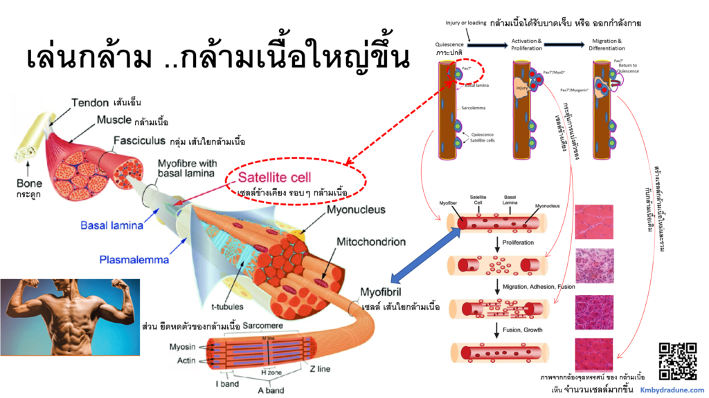 -ดังนั้น กล้ามเนื้อเราสามารถทำให้ใหญ่ขึ้นได้ครับ แต่ต้องใช้เวลา รอให้ satellite cell แบ่งตัวเพิ่มจำนวน ซึ่งต้องการสารอาหารจำนวนหนึ่งในการสร้างเซลล์ … โดยการกระตุ้นให้กล้ามเนื้อแบ่งตัวเพิ่มจำนวน จะเป็นการใช้งานกล้ามเนื้อ และ บางครั้ง ใช้งานจนเกิดการบาดเจ็บน้อยๆ เกิดขึ้นในเส้นใยกล้ามเนื้อด้วยครับ … การยกน้ำหนัก หรือ เพาะกาย จึงเป้นการใช้กล้ามเนื้อ ให้มากกว่า ขีดความสามารถปกติ ที่กล้ามเนื้อสามารถทำได้ จนเกิดการบาดเจ็บเล็กๆ เพื่อให้เกิดการสร้างกล้ามเนื้อเพิ่มเติมครับ