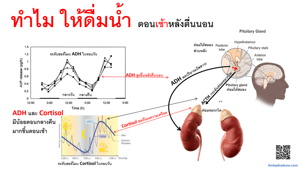 -มีปัจจัยหลายอย่าง นอกจากเรื่องนี้ ที่มีผลต่อระดับ ADH และ Cortisol…. แต่โดยทั่วไป จากข้อมูลข้างต้น บอกเราว่า หาก ADH สูง ความดันสูง ปัสสาวะน้อย และร่างกายรับรู้ความเครียดเพิ่มขึ้น ซึ่ง ไม่ดี ต่อสุขภาพ ดังนั้น การดื่มน้ำให้พอ โดยเฉพาะอย่างยิ่งหลังตื่นนอนจะช่วยลดภาวะดังกล่าวได้ครับ … แต่ ไม่ใช่ว่าต้องดื่ม 4 แก้วนะครับ ดื่มแค่ พอดีกับตัวเราครับ