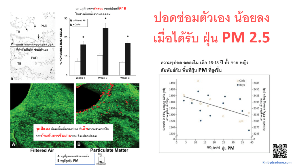 -ทุกวันนี้เรารู้สึกไม่สบายตัวเวลาฝุ่น PM2.5 เยอะๆ แต่รู้ไหมครับว่า มันทำอันตรายยังไงกับปอดของเรา … ที่สำคัญ คือ มันทำให้ ปอด ซ่อมแซมตัวเองได้น้อยลง น่าเป็นห่วงอย่างยิ่ง ในเด็ก และ วัยรุ่น เพราะ เป็นช่วงที่มีการเจริญของปอด และ ต้องใช้ปอดนี้ไปอีกนาน