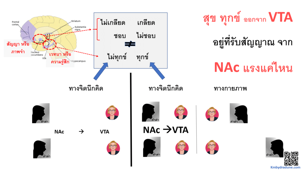 -ถ้าเทียบกับทางพระพุทธศาสนา กล่าวถึง ขันธ์ 5 ก็จะเทียบ NAc ได้กับ สัญญา และ VTA เทียบกับ เวทนา… ดังนั้น หาก NAc คุยกับ VTA ได้บ่อย ได้เร็ว เวลาเจออะไร ก็จะมีสัญญาณ ส่งถึงกันอย่างรวดเร็ว ความรู้สึก สุข หรือ ทุกข์ ก็จะเกิดขึ้นอย่างรวดเร็ว และ แรง เช่น ได้ยิน คำด่ากัน ไกลๆ แต่ เราก็เอามันมาส่งถึง VTA อย่างรวดเร็ว ก็เหมือน เราถูกด่า และ เกิดทุกข์ขึ้นทันที และ ทุกข์มาก โกรธด้วย ว่า ทำไมมาด่าเรา (ทั้งๆที่เป็นคำด่า คนอื่น ที่ไม่เกี่ยวกับเรา) แต่ถ้าหาก มีการหน่วง สัญญาณ จาก NAc ก่อนจะมาถึง VTA มีการประเมินสถานการณ์ ละเอียดขึ้น ไม่ได้ส่งมาที่ VTA ทันที โดยการมี สติ ก็จะช่วยให้ VTA มีความรู้สึก สุข หรือ ทุกข์ ตามสมควรแก่เหตุ
