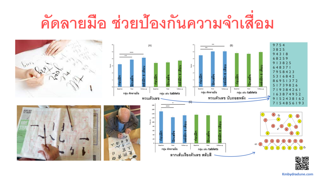 -ศึกษา อาสาสมัคร ที่เริ่มมีปัญหาเรื่องความจำถดถอย จำนวน 99 คน สุ่มเป็น 2 กลุ่ม กลุ่มแรกให้หัดคัดลายมือทุกวัน(51 คน) กลุ่มที่ 2 ฝึกการใช้งาน tablet ทุกวัน ต่อเนื่อง นาน 8 สัปดาห์ … ทั้ง 2 กลุ่ม ได้รับการทดสอบความสามารถในด้านความจำ เช่น การทวนตัวเลขที่ได้ยิน และ ทวนตัวเลขย้อนหลัง หรือ การลากเส้นเชื่อม ตัวเลขแบบสลับสี (ซึ่ง เป็นการทดสอบความจำ ที่เป็นมาตรฐานสากล โดยทดสอบก่อน เริ่มศึกษา, หลังการฝึกคัดลายมือเสร็จ (สัปดาห์ที่ 8) และ ติดตามทดสอบ หลังจากนั้น อีก 6 เดือน … ผลการศึกษา พบว่า กลุ่มที่คัดลายมือ มีความสามารถในการจำ ดีขึ้น ชัดเจน (คะแนนดีขึ้น และ ใช้เวลาน้อยลง) ขณะที่อีกกลุ่มหนึ่ง ความสามารถ คงเดิม ไม่แตกต่างจากก่อนเริ่มฝึก และ ความสามารถในการด้านจดจำ และ การทำงานด้านความจำของสมอง ดีขึ้นต่อเนื่อง แม้ผ่านไป 6 เดือน