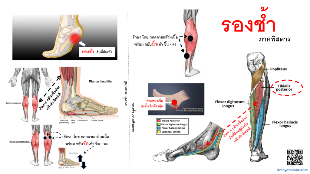 -ที่เล่ามา เป็น รองช้ำ แบบที่พบกันบ่อยๆ ทั่วๆไปครับ … แต่ มี รองช้ำอีกประเภทหนึ่ง ที่แตกต่างกันออกไป ไม่ได้มีสาเหตุจากกล้ามเนื้อ gastrocnemius ที่เกร็งตัวหรือเป็นตะคริว แต่ เป็นกล้ามเนื้อมัดเล็กกว่า ที่ซ่อนอยู่ด้านใน … กล้ามเนื้อ ชุดนี้ ก็ได้รับบาดเจ็บได้ จาก ท่าเดินหรือวิ่งที่ผิดท่า คือ มีการเกร็ง และ ปัดเท้าเข้าด้านในมากกว่าปกติ … ตำแหน่ง รองช้ำของ กรณีนี้ จะเจ็บที่ส้นเท้าเหมือนกัน เป็นมากเวลาลงน้ำหนักเหมือนกัน แต่ว่า ตำแหน่งจะอยู่ ค่อนมาใต้ ตาตุ่มด้านใน อยู่ด้านหน้ากว่า และ สูงกว่า รองช้ำปกติเล็กน้อย … กรณีนี้ เกิดจากการเกร็งตัวของกล้ามเนื้อ Tibialis Posterior ซึ่งไขว้ทับซ้อนกับ กล้ามเนื้อที่จิกนิ้วเท้า และ นิ้วหัวแม่เท้า ลงล่าง (ไม่ใช่จิกข้อเท้า เหมือนรองช้ำปกติ) กล้ามเนื้อเมื่อบาดเจ็บ และ ตึงไม่ยอมคลายตัว จะเกิดการเสียดสีกัน และ ดึงให้จุดที่กล้ามเนื้อเกาะอยู่ที่กระดูก เกิดอาการเจ็บ แบบ รองช้ำเหมือนกัน ผม เลยเรียกว่า รองช้ำภาคพิสดาร ครับ … การแก้ไข ใช้ หลักการเดียวกันครับ คือ คลายกล้ามเนื้อพร้อมกับ ขยับจิกนิ้วเท้า สลับกับกระดกนิ้วเท้า จุดทีกด หรือ ฝังเข็ม คือ จุดกลางน่อง และ ขาด้านใน เหนือตาตุ่มครับ