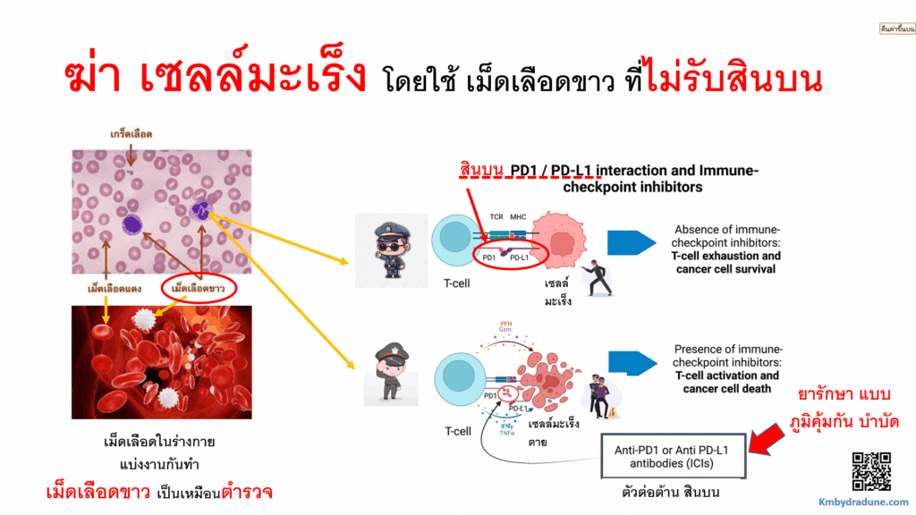 -ฟังดูคุ้นๆ ไหมครับ ตำรวจไม่จับผู้กระทำผิด เพราะ มีข้อมูลว่า หรือ มีรหัสว่า เป็นพวกเดียวกัน คล้ายๆ กับ ส่วย ต่างๆ ไหมครับ ทั้ง ส่วนเว็บพนัน ส่วยบ่อน ส่วนผับบาร์ที่ผิดระเบียบ ส่วนสติ๊กเกอร์ทางหลวง ฯลฯ…. จะเห็นว่า ในกระบวนการของเซลล์มะเร็ง ที่พัฒนาตนเอง ให้อยู่รอด จะใช้วิธีการ ที่ หลอก หรือบอก ตำรวจ ให้ไม่มาจับ…. ในปัจจุบัน มีตัวยา ที่ไป ปิดกั้น PDL-1 ไม่ให้ทำงาน เหมือนกระบวนการ ไปปิด สติ๊กเกอร์ส่วย หรือ ตรวจจับบัตรประชาชนปลอม ทำให้ เซลล์มะเร็ง ไม่สามารถ ซ่อนตัว หรือ หลบหลีกตำรวจได้อีกต่อไป พอ PDL-1 ใช้การไม่ได้ เซลล์มะเร็ง ก็ถูกจับ และ ทำลาย เป็นวิธีการ ที่แค่ ทำให้ระบบภูมิคุ้มกันของร่างกายเราทำงานได้ดี ทำงานได้ปกติ ก็ชนะ เซลล์มะเร็งได้แล้ว