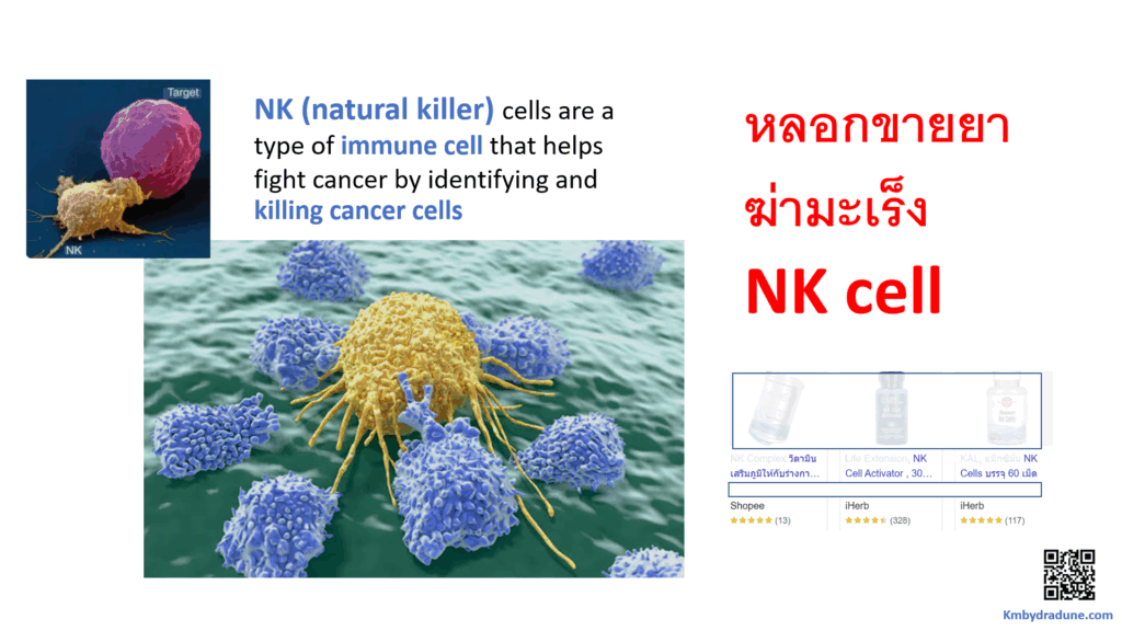 -การรรักษาทั้ง 2 แบบนี้ ล้วนมี NK cell ซึ่งเป็นเซลล์เม็ดเลือดขาวที่มีอยู่ตามปกติ ในร่างกายของคนเราอยู่แล้ว เพียงแต่ว่า การทำให้รักษาได้ ยังไม่ได้ง่ายมาก แบบเดียวกับ การฉีดยา หรือ ผ่าตัด ยังมีขั้นตอนปฏิบัติหลายขึ้นตอน … แต่ด้วยความที่ NK cell มีความสามารถเป็นพระเอก จึง มีกระบวนการ ล่อหลอก ว่ามีวิธี การเพิ่ม NK cell ให้กับร่างกาย มียากิน ที่ขาย ตาม platform online หรือ บางคลินิก ไม่กี่เม็ด หลัก พันบาท หรือ มีการพูดถึง ประสิทธิภาพของยา ว่า กินยาแล้ว เจาะเลือดดูระดับ NK cell ดูสิ ว่ามันเพิ่มขึ้นไหม … เป็นเหตุ ให้คนไข้บางคน หลงเชื่อ อยากลอง เพราะ รู้สึกว่า ง่าย แค่ กินยา ไม่ต้อง ฉีดยา ไม่ต้องผ่าตัด ไม่ต้องผมร่วง ไม่ต้องถูกฉายรังสี และ ราคา ก็ไม่แพงมาก ซื้อได้ …ประมาณนั้น