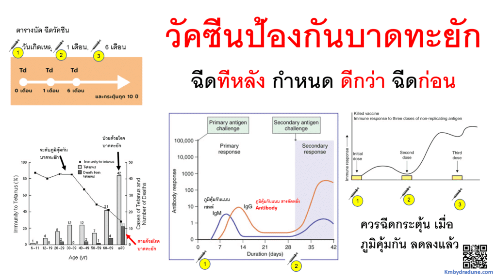 -นี่คือ ที่มาของการ ต้องฉีดวัคซีนมากกว่า 1 เข็ม และ พอ เข็ม 3 จะมีภูมิคุ้มกัน IgG สูงขึ้นไปอีก และภูมิคุ้มกันอยู่ได้นานอีก ของบาดทะยัก จะอยู่ได้นาน เกิน 5 ปี (รูปขวา) แต่ เวลาที่ได้ผลในการฉีดวัคซีน คือ ต้องรอให้ ภูมิคุ้มกันลดลงก่อน ไม่เช่นนั้ นวัคซีน ที่ฉีดเข้าไป จะถูกจับ และ ทำลายก่อน ทำให้เหลือวัคซีนจำนวนน้อย ไว้สำหรับกระตุ้นภูมิคุ้มกัน … ในกรณีของบาดทะยักนี้ จึงให้เว้นช่วงที่ 1 เดือน กับ 6 เดือน และ จะเลยไปกว่านั้น เล็กน้อยก็ได้ แต่ ไม่นานจนเกินไป เพราะ ถ้านานมาก IgG จะจำไม่ได้ แล้ว ต้องเริ่มกันใหม่ …. แต่ถ้าฉีดเร็วเกินไป IgM จะยังมีปริมาณสูงอยู่ จะเข้าทำลายวัคซีนของเรา ไม่ได้เกิดการกระตุ้นภูมิคุ้มกัน เท่ากับ ต้องนับเข็มนั้น เป็นเข็มก่อนหน้าอีกครั้งครับ