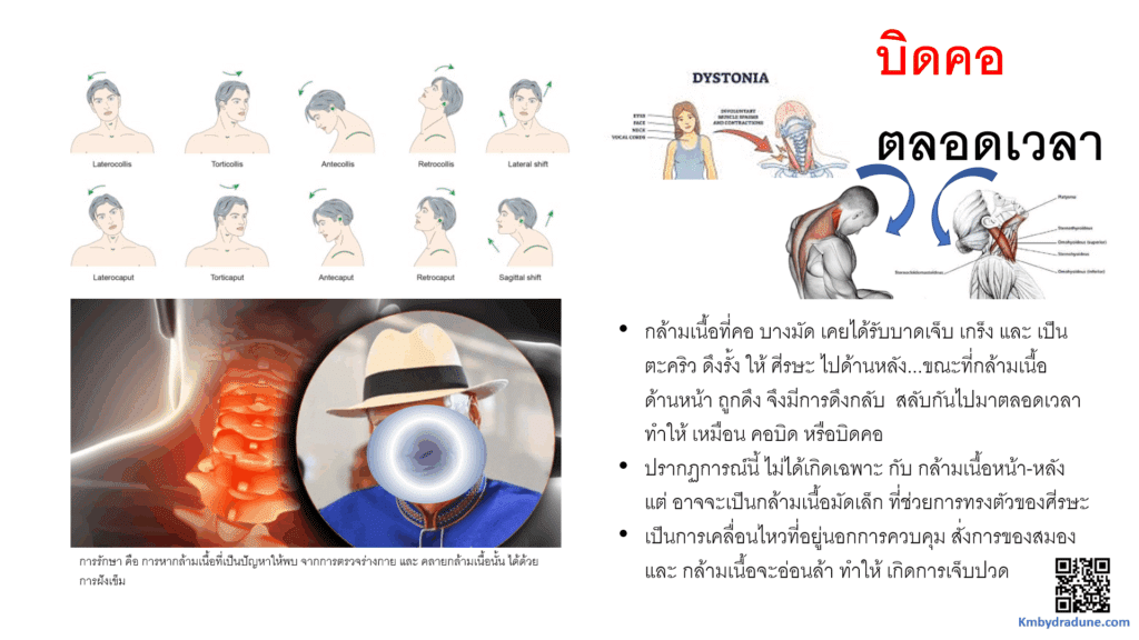 -ทางการแพทย์ มีการระบุกลุ่มอาการนี้ว่า Dystonia หรือ การทำงานของกล้ามเนื้อที่ไม่ปกติ ซึ่ง มีลักษณะ ที่คล้ายๆกัน แต่ไม่เหมือนกันซะเลยทีเดียว ในทางการแพทย์ ปัจจุบัน ยังหาสาเหตุไม่ได้ แต่ตรวจพบว่า มีการสู้กัน ระหว่าง กลุ่มของกล้ามเนื้อที่เงยหน้า กับ กล้ามเนื้อที่ใช้ก้มหน้า ซึ่ง เป็น กล้ามเนื้อคนละกลุ่มกัน อยู่ที่ด้านหน้า และ ด้านหลังของลำคอ และ ศีรษะ .… พบว่า เมื่อกล้ามเนื้อกลุ่มหนึ่ง มีการเกร็ง ตะคริว หรือ ดึงรั้ง เช่น ดึงศีรษะ ไปทางด้านหลัง กล้ามเนื้อคอ ด้านหน้า จะรับรู้ถึง ความไม่ปกติ ของตำแหน่งของศีรษะ และ เมื่อถูกตึง จะเกิดการเมื่อล้า จึงมีการพยายามดึงกลับ ให้ศีรษะก้มมาทางด้านหน้า …. แต่พอศีรษะ ถูกดึงมาทางด้านหน้า กล้ามเนื้อคอ ด้านหลังที่เคยบาดเจ็บ และ เป็นตะคริว เกิดอาการถูกดึงรั้ง ก็มีความเจ็บ (แต่ไม่มา ร่างกายไม่ได้รู้สึกชัดเจน) ก็กระตุ้นให้มีการดึงกลับ … เป็นอย่างนี้ สลับกันไปมา เป็นวงจร สลับกันไป โดยที่เจ้าตัวก็ไม่รู้สึกตัว หรือ ควบคุม บังคับให้หยุดไม่ได้
