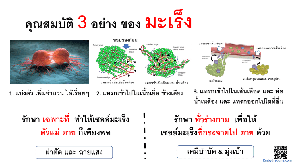 -หากมะเร็งนั้นยังมีคุณสมบัติแค่ ข้อ 1 เพียงอย่างเดียว (ระยะ 0) หรือ หากเริ่มมีการแทรกเข้าไปเนื้อเยื่อใกล้เคียง แต่ยังไม่แพร่กระจาก การรักษา ก็จะสามารถทำโดยการควบคุมก้อนมะเร็งตัวแม่ด้วยการ ผ่าตัด หรือ ฉายแสง ก็เพียงพอ แต่ ถ้าเริ่มพบเห็น หรือ เห็นแนวโน้มว่า จะมีการแพร่กระจายแล้ว ก็ต้องมีการรักษาทั่วร่างกาย ด้วยยาเคมีบำบัด และ ยามุ่งเป้าร่วมด้วยครับ… การรักษา หลัก ก็จะเป็น 2 กลุ่มใหญ่ แต่จะมีรายละเอียด ที่ได้รับการพัฒนา เพิ่มเติม ตามแต่ นิสัย และ การดำเนินโรคของมะเร็ง ครับ ซึ่ง มะเร็ง ในอวัยวะเดียวกัน ในผู้ป่วยคนละคน ก็อาจจะมีนิสัย หรือ พฤติกรรมที่แตกต่างกันไปได้ครับ … แพทย์จึงมีการตรวจละเอียดเพิ่มเติมม จากเนื้อเยื่อที่ตัดไปตรวจครับ