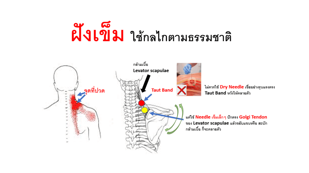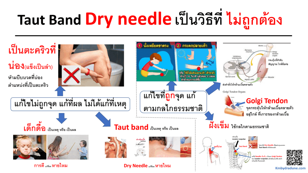 -ตังนั้น จึงไม่จำเป็นต้องไปเขี่ย Taut Band ให้เจ็บ ให้ได้รับบาดเจ็บ เพื่อหวังให้มันคลายตัว การทำแบบนั้น เหมือน การไปดีเด็กดื้อ หรือ เหมือนการไปนวดที่น่องตอนที่เป็นตะคริวที่น่องครับ ไม่มุ่งโทษที่ผล โดยไม่ได้รักษาเหตุ